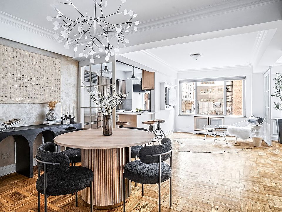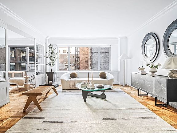 This sprawling residence is awash with morning light thanks to Eastern exposures. As you step inside, you'll be greeted by the timeless charm of crown moldings and the warmth of hardwood floors throughout. Two large closets—one of which is a walk-in—grace the wide entryway, leading into an impressive living room, currently configured as an open-plan living and dining area, but can easily be configured into a third bedroom. Central AC, oversized windows and a bar that includes wine bottles and glasses storage and a slide-out bar table make this home an ideal place for entertaining.