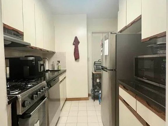The separate galley kitchen has generous counter and cabinet space and has been updated with stainless-steel appliances.