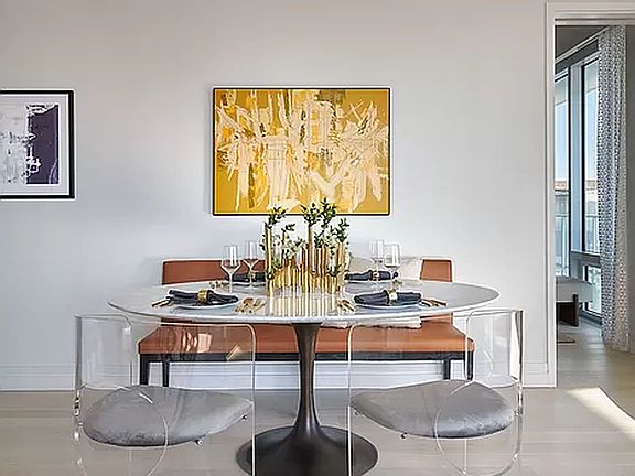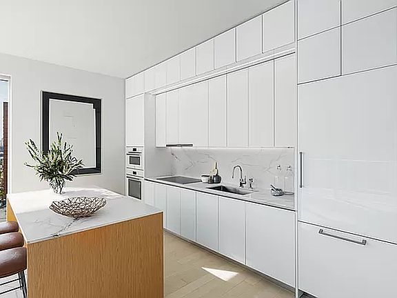 This remarkable 977 square-foot one-bedroom, one-and-a-half bath light-filled corner residence features 22 linear feet of terrace space with exposures to the north and east. The floor-to-ceiling glass windows and expansive 10’ ceilings tie the inside/out living concept together perfectly. The 231 square-foot terrace seamlessly connects the great room to an open kitchen outfitted with Italian white glass and aluminum trim cabinetry by Aran Cuchine, book matched honed Calacatta marble slab countertops, full-height backsplashes, and integrated Brilliant White glass appliances by Miele including an integrated wine refrigerator.