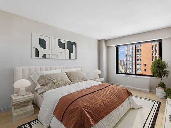 The apartment features stunning open views east over the 59th Street Bridge and East River, and North over beautiful brownstones with great light. This apartment has beautiful hardwood floors throughout, floor to ceiling windows with a sliding door which opens to the wrap around terrace at the side of the living room. There is a fully updated kitchen with beautiful cabinetry, granite counter tops and stainless appliances. A large bedroom with two picture windows facing north over 61st Street, a marble bathroom with a stall shower and a separate Jacuzzi tub, and excellent closet space throughout. Washer/dryers are permitted, as are pets.