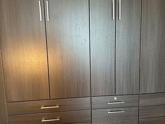 Bedroom with large built-in closet with tons of storage, overhead lighting and side tables and lamps.
