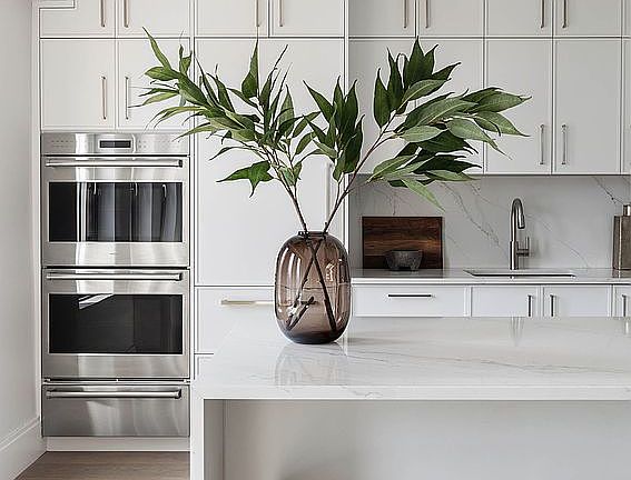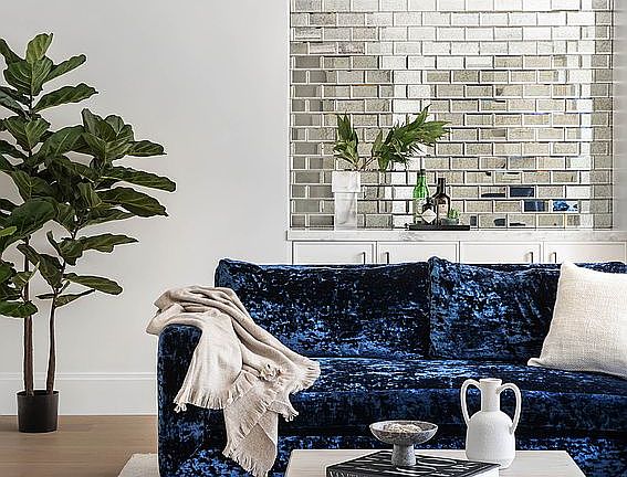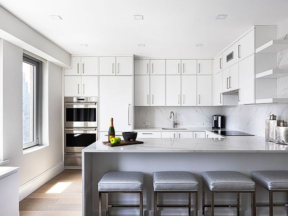 Spanning more than 2,100 square feet, this sun-kissed corner residence welcomes you inside with a bright and airy ambiance accentuated by tall ceilings, pale wide-plank hardwood floors and oversized windows on the eastern and southern exposures. A gracious foyer flanked by a coat closet and a chic powder room opens to an inviting living room, the perfect spot for relaxing surrounded by south-facing skyline views, a dazzling mirrored bar area and a convenient beverage center. The adjacent windowed kitchen sets the stage for lively chef's table-style entertaining with a large dining area and a wide waterfall bar counter. Sleek floor-to-ceiling cabinetry, hand-selected white marble and bookmatched backsplashes are joined by an array of stainless steel appliances, including a glass cooktop, Wolf wall ovens, cabinet-front dishwasher, Sub-Zero refrigerator and drawer microwave.