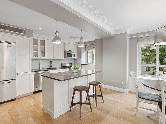 An inviting foyer opens to a spacious great room with oversized windows bathing the home in natural light through southern and eastern exposures. Overlooking the private gardens of Manhattan House, the open floor plan feels airy and elegant with 4-inch white oak hardwood floors and beautiful crown molding. The windowed kitchen is equipped with top-of-the-line Viking Professional stainless-steel appliances including a wine cooler, Ann Sacks glass tile backsplash and Caesar stone counter top/center island. A gracious bedroom, facing the garden, features a wall of closets. The master bath features a Zocalo Creme marble floor and walls with polished chrome fixtures. The layout of this one bedroom is ideal with the bathroom and a Bosch washer/dryer just outside the bedroom. A perfect pied a terre or primary residence and the building is pet friendly.