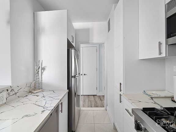 The apartment also features an extra-large, pass-through chefs kitchen, ideal for hosting, with ample counter space and cabinetry, as well as hallway, lined with an abundance of closets, providing plenty of storage options before leading into a gorgeous black marbled bathroom. King sized bedroom of course.