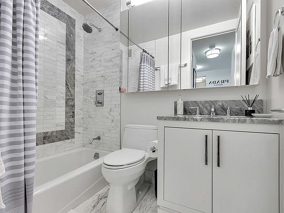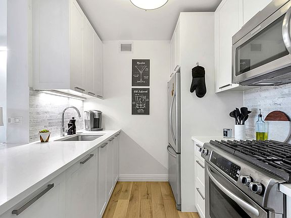 A gut renovated, one bedroom apartment in a full service luxury condominium building. Oversized windows with city views and beautiful natural oak floors though out and in unit washer/dryer. Separate kitchen is enhanced with high-end finishes, stainless steel appliances, including dishwasher and built-in microwave. While in the kitchen, overlook the large living room, with breakfast bar, Soffit LED lighting, modernized shades and abundant room for all of one's furniture including a dining table. A marble designer bathroom, leads to the king size bedroom with double closet and custom built-in cabinetry for ample storage space.
