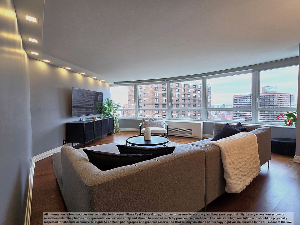 Fully furnished two-bedroom, two-bath home to dream about now available at Carnegie Park Condominium! This light-filled corner residence showcases breathtaking North, Eastern, and Western exposures through its rounded wall of windows, offering sweeping views of Central Park, the George Washington Bridge, and the East River.