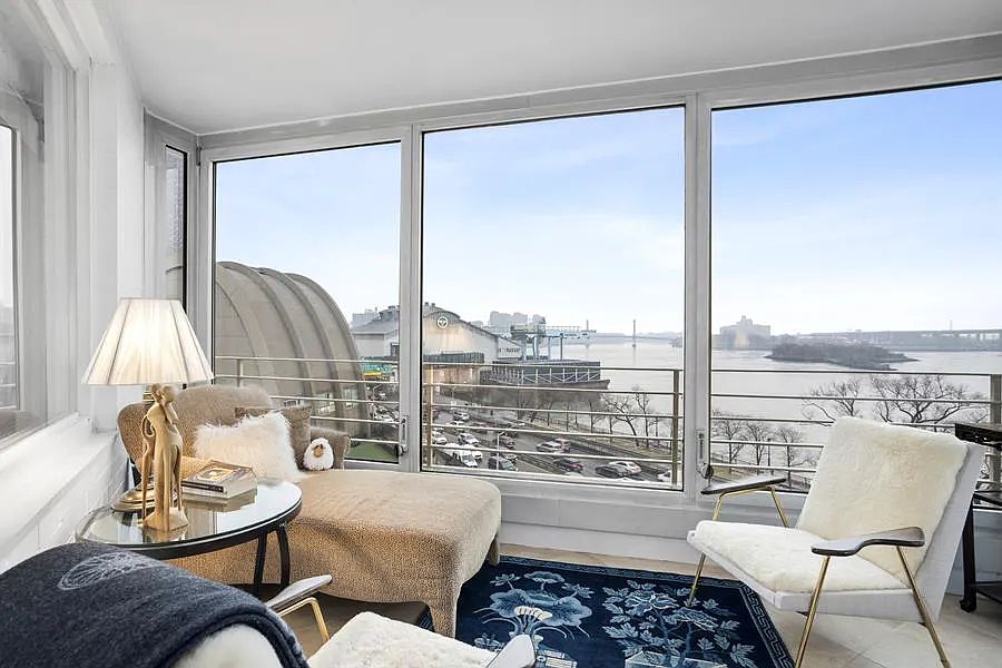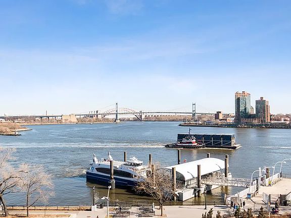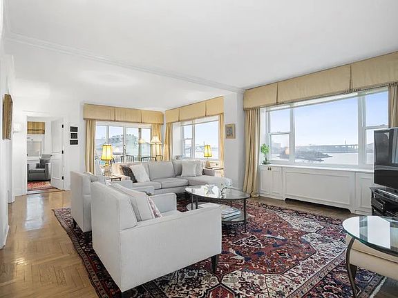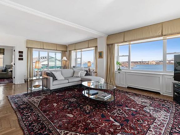 An expansive and elegant apartment in a classic Mid-Century Modern building, #6EF, 200 East End Avenue was created by combining two of the original units. Overlooking the East River and adjacent to Carl Schurz Park and the East River Prominade, the building offers privacy, unique panoramic prospects and plenty of space. A foyer and gallery opens up into an impressive, light-flooded living room. Twin balcony terraces, one converted to a year-round sunroom, flank this space while soundproof windows throughout ensure peace and quiet. Arranged around the living room are a spacious den (a possible fourth bedroom) and a charming office with built-in bookshelves; the large kitchen and dining room offer perfect opportunities for entertaining. Two of the bedrooms are configured with ensuite bathrooms and huge walk-in closets, with the master bedroom's closet outfitted with a sink; the third bedroom is adjacent to the third bath, which also serves as a powder room. Gorgeous river and city views throughout (with an opportunity to expand those of the kitchen), hardwood parquet and herringbone floors, an in-unit Bosch washer/dryer system, ample closet space in every bedroom and marble fixtures in all of the baths round out the details. 200 East End Avenue is a full service cooperative building with a doorman and concierge. A striking design by architect and urban planner Lathrop Douglas, it was built in 1953 and incorporates a garage and private gym for residents. The area is just north of the East 86th Street corridor, full of shops and restaurants as well as the cultural offerings of the Upper East Side. Transit opportunities include a directly adjacent East River Ferry dock with service to Brooklyn and Wall Street. An opportunity to create a stunning home in one of the city's best neighborhoods