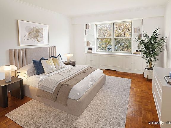 This one bedroom one bath facing east with views of the river and Tri-borough Bridge from both the living room and bedroom is bright and sunny. The bedroom with excellent closets will easily fit a king bed and furniture and the living room is over 24 feet long. Just off the separate fully equipped kitchen is the dining area. The apartment features a wealth of additional closets hardwood floors and is pin drop quiet. Apartment 4G will require your imagination and creativity to make this your home.