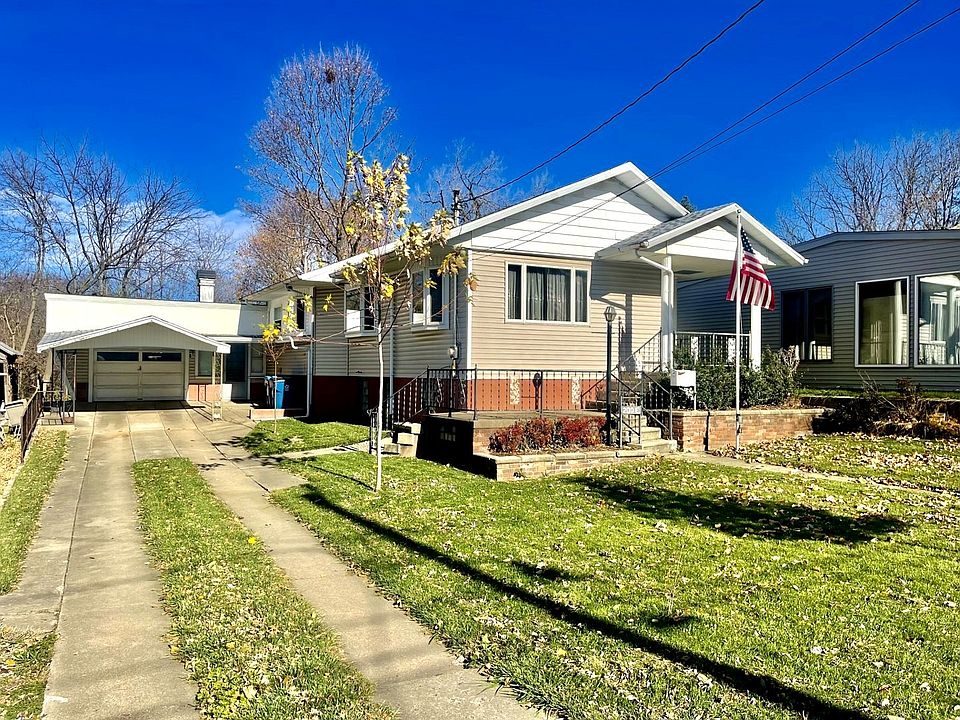 Move right into this solid 3-bedroom home. Features include a spacious living room open to dining area, 2 large view bay windows in the living room and dining area. The kitchen has a breakfast bar, plenty of cabinets, double sink, newer stove top, built in oven, and refrigerator included. Large full bathroom. There is a remodeled rec room with vinyl plank flooring and a family room with built in bar. Full basement with laundry, the washer and dryer stay. The 2-car tandem garage has plenty of space and storage as well as a covered entrance. Roof (2023) water heater (2018) Lovely backyard setting with patio, porch and deck overlooking beautiful wooded area.