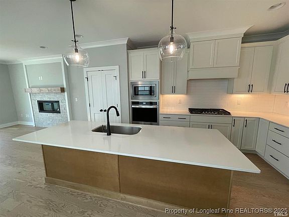 The chef's kitchen features quartz countertops, stainless steel appliances, a 10-foot center island, and abundant cabinet space, opening to a bright living room with a gas log fireplace perfect for cozy evenings.