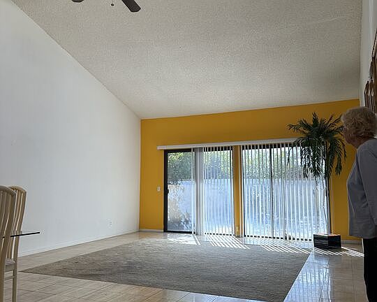 Rehab opportunity! Make this your own 3 bedroom, 2 bath, condo. Living area has high beamed ceiling including high placed windows for lots of light, overlooking a private back patio with a peek-a-boo mountain view. Primary bedroom with bathroom has direct access to the back patio. Second bedroom is an en suite with bath attached, also used as the guest bathroom, and nice size closets. Third bedroom includes large walk in closet and picture window to the front patio. Washer and dryer inside unit