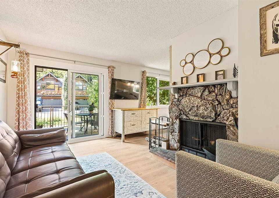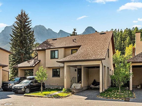 Welcome to your slice of heaven in majestic Canmore! Tucked away in the tranquil complex of Three Sisters Place, this inviting townhome truly offers it all – breathtaking mountain views, direct access to walking and biking paths, and a pleasant stroll to the Bow River and downtown! The exceptionally well-maintained unit offers nearly 1100 SF of relaxed living space including 3 bedrooms and 1.5 baths. A charming living room centers around a cozy wood-burning fireplace making for the perfect spot to relax after a day on the slopes. The functional kitchen boasts ample cabinetry, stainless steel appliances, and a portable island while the bright dining area easily seats 10. A stylish powder room with a sliding barn door completes the main floor. The beautiful luxury plank flooring continues up the stairs and across the second level. The generous primary bedroom comfortably accommodates a king-sized bed and features a large closet. Two additional bedrooms and a 4-piece bathroom with quartz counter and vessel sink round off the upper level. The unspoiled lower level offers excellent potential to develop an additional 600 sq. ft. of living space while currently accommodating laundry, a home gym, and abundance of year-round gear. Outside, an airy deck opens directly to a walking path and a stunning Three Sisters Mountain vista. Other notable highlights of this special gem include 1) covered tandem parking, 2) triple pane Lux windows and sliding door (2020), 3) new LVP, baseboards, lighting fixtures, all in the last 5 years, and plumbing (toilets, sinks, fixtures) all updated. Ideally located, this picture-perfect townhome allows you to fully enjoy the Canmore lifestyle – from exploring endless trails and paddleboarding on pristine waters, to mountain biking rugged paths or strolling to your favourite downtown pub. This exceptional property combines Canmore charm, thoughtful updates, and unbeatable Rocky Mountain acces.
