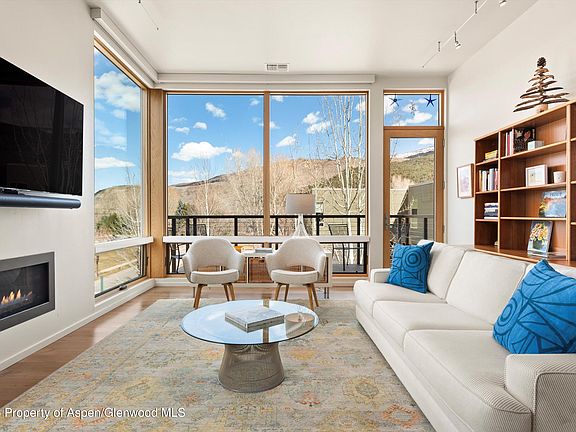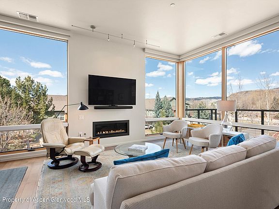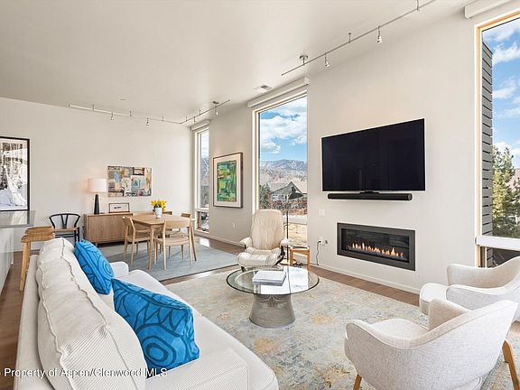 Park Modern Preferred - a rare top-floor corner unit with breathtaking park and mountain views. This highly sought-after one-bedroom, one-and-a-half-bathroom condo features floor-to-ceiling windows, an open floor plan, high ceilings, and a cozy fireplace. The gourmet kitchen boasts sleek white cabinetry, pristine countertops, and ample storage. The spacious primary suite includes generous closets and a spa-like en suite bath with a soaking tub and glass-enclosed shower. A private deck is perfect for entertaining. Enjoy secure building access, an ADA-compliant elevator, heated underground parking, and private storage. Just minutes from Whole Foods and Willits Town Center, with easy access to the Rio Grande Trail and Crown Mountain Park. Only 30 minutes to Aspen and Snowmass.