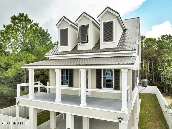 Beautifully constructed masterpiece! Walk to the beach! This thoughtfully designed home is a perfect blend of elegance and functionality. Featuring an open floor plan with high ceilings, this 4 BD/4.5 Bath stunner boasts a spacious kitchen complete with a large island, quartz countertops, farmhouse sink, and plenty of storage! (Electric or gas hookups for oven/range) The den offers a cozy fireplace, while the downstairs primary suite provides comfort and convenience. Stucco exterior adds to the timeless appeal. Enjoy ample outdoor entertaining space beneath the home, pre-wired for cargo lift & gas generator! Equipped with 2 central AC units, foam insulation & 2 water heaters for maximum comfort. Hurricane shutters for peace of mind! Fenced yard! Just a short walk to the beach and a golf cart ride to Bay St. Louis! Don't miss this opportunity to live the coastal lifestyle!