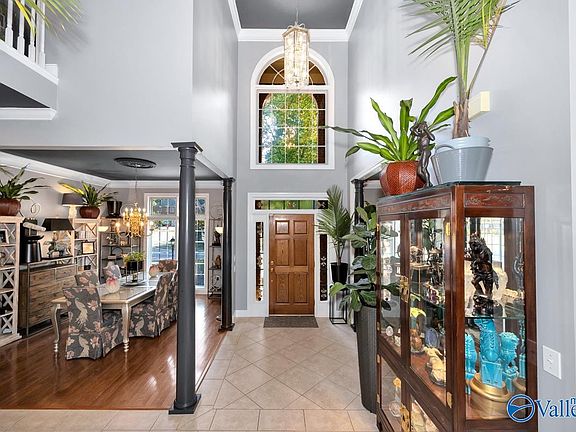 Elegant home in the tucked-away community of Stratford Square Estates, located in the heart of Madison City. Grand entrances include circle driveway and two-story foyer with curved staircase. Formal Dining and Living Rooms located off the Foyer. Living Room features double trey ceiling and fireplace. Spacious Kitchen with curved island and lots of storage. Main level Primary Suite features vaulted ceiling and private bath with double vanity, jacuzzi tub and separate shower. Incredible outdoor spaces including screened porch and patio with scenic backyard. Side entry driveway and 3 car garage with lots of parking availability.