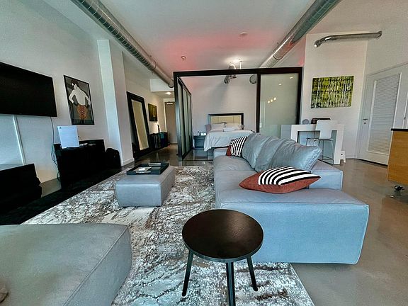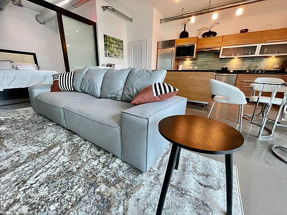 Polished concrete floors throughout. Curl up on the oversized Mario Capasa couch or armless lush lounger. Whip up some of your favorites in the fully appointed chef's kitchen with a roll away island, Italian cabinetry, stainless steel appliances,and gas range.