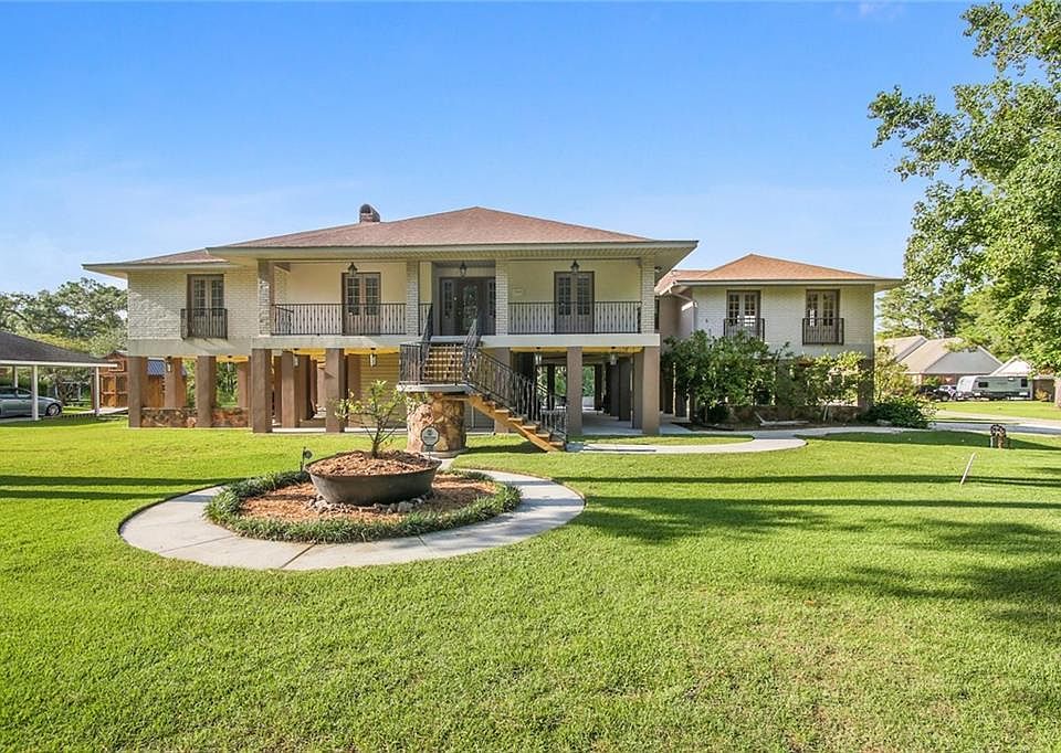 RAISED WATERFRONT OASIS Solid brick home w/guest house on oversized lot. Birds eye view from the balconies. Main house has spacious den w/cath ceil, stone fp & wet bar. Open kit w/plenty cabinets, stainless appliances, new floors. Antique look vanities, claw foot tub, pretty crown, recessed lights & elevator. Primary bdrm has HUGE closets. 4th bdrm with closet could be game/media room. Furnished guest house has bdrm, eat in kit & full bath. Back deck great for throwin a fishing pole.