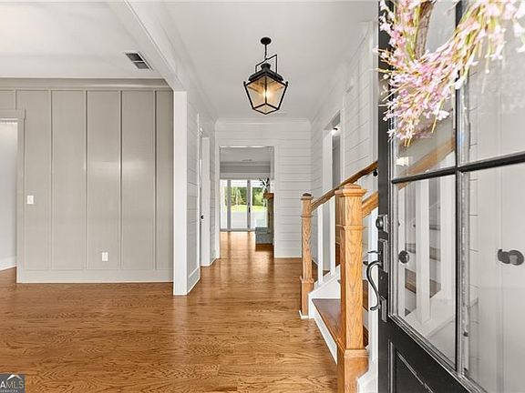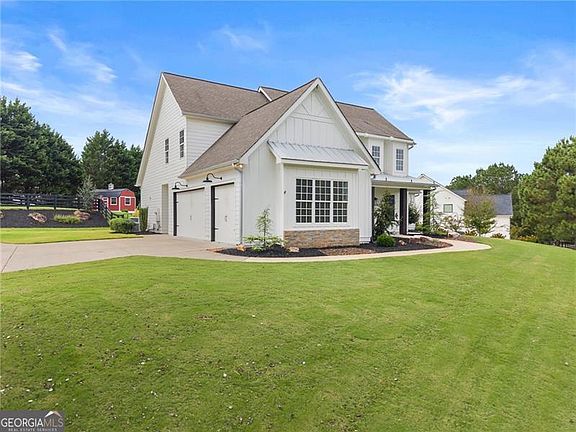 Welcome Home! Nestled on an oversized lot with no HOA, this custom-built farmhouse greets you with a wide rocking-chair front porch featuring timeless herringbone brick detail, an expansive driveway, and a three car side entry garage. Inside, hardwood floors, 10-foot ceilings, 8-foot doors, and shiplap accents carry throughout the open layout. The dining room with board and batten accents sets a welcoming tone before flowing into the chef's kitchen. Designed for both everyday living and entertaining, it features a large working island, wall oven, gas cooktop, and custom vent hood. A mini butler's pantry with wine fridge and a separate pantry with custom wooden shelving add style and function. From here, the kitchen overlooks the living room with a stunning stone fireplace, while four-panel bi-folding doors extend the living space into the sunroom for a seamless indoor-outdoor connection. Just off the garage entry, a convenient drop zone and private side entrance add everyday ease. The main-level owner's suite is a true retreat, featuring a spa-like bath with freestanding tub, shower, double vanities and an expansive walk-in closet. Upstairs, three spacious bedrooms and two full baths offer flexible spaces and room to grow - ideal for guests or a dedicated home office. Step outside to your private backyard oasis, framed by mature trees - perfect for the pool of your dreams. Enjoy the custom outdoor firepit, lush landscaping, a full irrigation system, and a fully fenced yard designed for play or relaxation. A powered 10x20 shed offers endless possibilities for storage, a workshop, or creative projects. With easy access to 575, 20, top-rated schools, Canton Marketplace, Northside Hospital, Gibbs Gardens, Lake Allatoona, and the North Georgia Mountains, this home blends timeless farmhouse character with modern convenience - designed for the way you want to live!