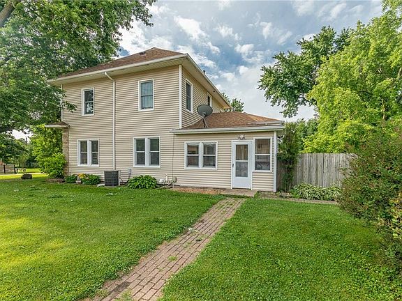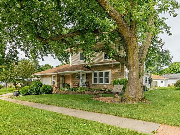Invite you to a truly updated turn of the century farmhouse in the City Limits. A double lot yard for family fun surrounded by a full privacy fence. City park across the street, bike trail and restaurants within walking distance. Furnace, windows, roof and siding have been replaced. Kitchen and both bathrooms have been updated, 3 bdr, 1 full and ¾ bath. 1st floor office or 4th bedroom. Large walk-in cedar coat closet and heated solarium (4 season porch). Two single garages and fire pit area in private back yard. Front yard swing to enjoy city park, town functions and city parades.