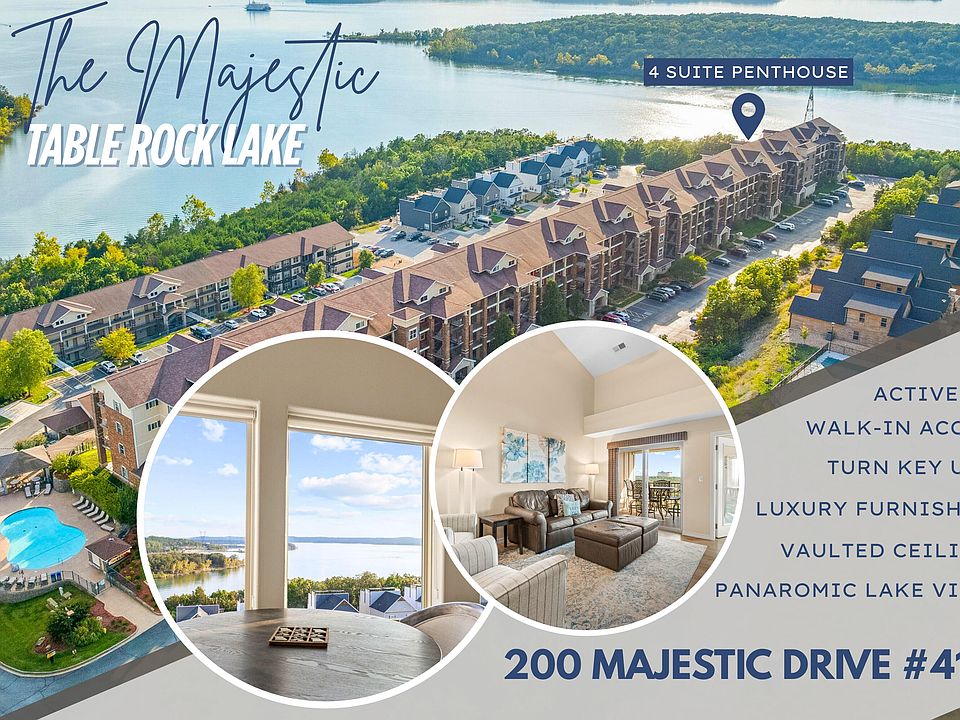 Stunning Penthouse at The Majestic - Nightly Rental Approved with Unmatched Lake Views! Experience lake life luxury at its finest! This 4 bed, 4 bath TURNKEY-furnished penthouse condo at The Majestic offers the best of both worlds: a serene Table Rock Lake retreat and a proven nightly rental investment.This unit (with elevator access) is designed to impress--featuring PANORAMIC LAKE VIEWS, sleek hard-surface flooring, modern gray cabinetry, quartz countertops, stylish fixtures, and custom designer window treatments that frame the view to perfection.Each spacious bedroom includes a private en suite bath, ensuring ultimate comfort for guests and maximizing rental potential. The open-concept design flows seamlessly onto your covered balcony--perfect for morning coffee, evening cocktails, or soaking up unforgettable sunsets.Community amenities include a pool, grilling area, and beautifully maintained grounds. COA dues cover water, sewer, trash, building maintenance, and landscaping, making ownership effortless.All this, just minutes from State Park Marina, Moonshine Beach, Silver Dollar City, and the Branson Strip. A third-party boat slip is available--ask for details.Don't miss your chance to own one of the most desirable condos on Table Rock Lake. Be sure to check out the Virtual Tour!