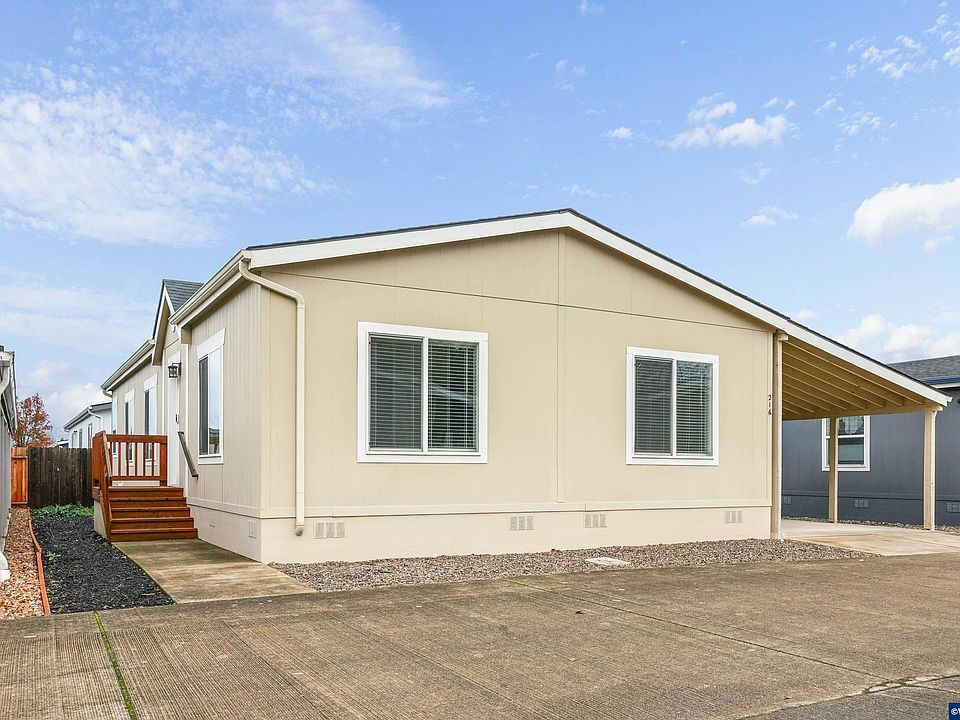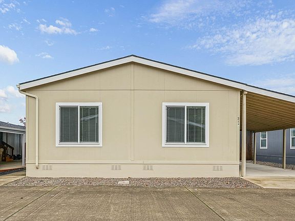 Sparkling clean & tons of space, almost entirely new! 3 bedroom affordable ONE LEVEL home with fantastic floorplan & all the extras! Large primary suite with walk-in closet & soaker tub! Big open kitchen w/stainless steel kitchen appliances, center kitchen island, and an abundance of beautiful wood cabinetry. Vaulted ceilings, a proper mudroom, and luxury vinyl plank floors. Extra wide & deep carport, fenced yard, and $849/month space rent. Must see this home, incredibly comfortable and easy living!
