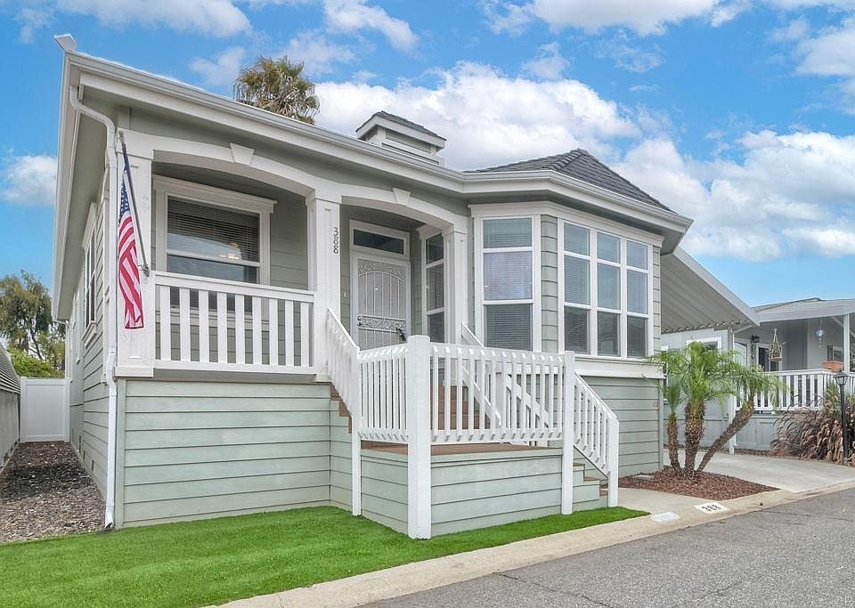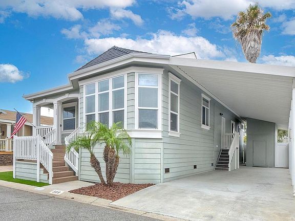 2014 One owner Manufactured Home at Rancho San Luis Rey 55+ Community. Monthly space rent of $575. This custom home Features Three Bedrooms and Two Bathrooms, 1600 sq.ft., eat in Kitchen with a bay window, open floor plan, spacious kitchen with Dutch white cabinets, all appliances are included, opens to laundry room with washer & dryer, storage and pantry. Tall ceilings and large dual pane windows fill the Living room with light as it overlooks the front covered porch, great for viewing all the going on’s. Guest parking is directly across the street. The primary bedroom has attached oversized bathroom, step in shower, separated dual sinks and walk in closet. The second full bathroom has tub/shower combo. The second and third bedrooms are nice size and have closets, with hallway access to second bathroom. The entire home is all drywall. Central AC/HVAC. Composition Roof. Private Back Yard with paver patio that is fully fenced with white vinyl and block wall . No neighbors behind your private back yard. Side yard features fully covered concrete driveway, side entrance, and work room / storage building with electricity, lighting and ceiling fan. Rancho San Luis Rey Park is level and easy to stroll around. Community amenities include: two pools, two Clubhouses with kitchens. Card rooms. billiards, pickle ball and lots of events for you to join. Two small are pets welcome. Surrounding neighborhood is just steps away with several shopping centers. Anchor stores are grocery stores, banks, coffee shops, restaurants, pharmacy’s, library and post office. You are within five miles of enjoying the Oceanside pier, harbor, theaters, and Farmer’s markets on Thursday morning and summertime evenings. Available financing.