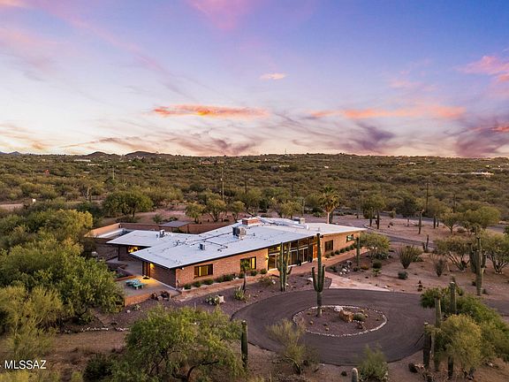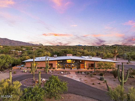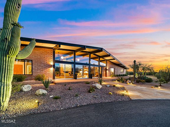 Welcome to this exquisitely revitalized Mid Century Modern masterpiece, a true architectural treasure in the iconic Frank Lloyd Wright style. Designed by renowned architect, Floyd L. Cullop, and built in 1967, it is nestled on a sprawling 3.33 acre lot. The home offers direct access to the captivating Saguaro National Monument East, which is just blocks away. This remarkable, absolutely one of a kind property harmonizes classic design with modern luxury, encapsulating the essence of Tucson's distinctive architecture. This iconic architectural gem features original burnt Adobe brick post-and-beam construction throughout, Located in the highly sought after community of ''The Notch'', the property presents breathtaking panoramic mountain views. Where nature's beauty unfolds in every direction, offering spectacular sunsets and the serene presence of over 100 majestic saguaros gracing the landscape. Inside, the home boasts 5 elegantly appointed bedrooms, each designed to provide comfort and tranquility.