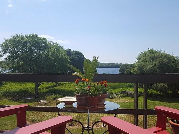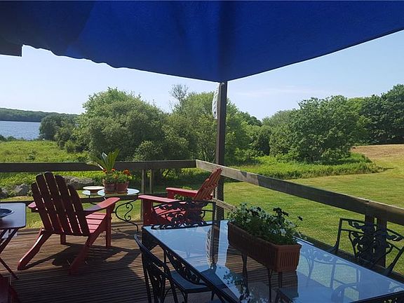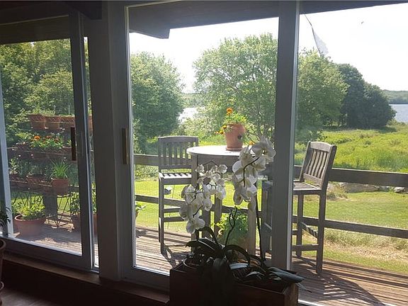Spacious contemporary ranch on 6.84 scenic acres overlooking Nonquit Pond. Tranquil setting with meadows and stone walls. Short walk to Four Corners and close to beaches! Almost every room in the house offers water views. This four bedroom, four bathroom home features a cathedral ceiling great room with hardwood floors, wood burning fireplace and sliding glass doors to a wraparound deck. The main level also consists of a master bedroom suite, family room with fireplace, separate wing with another bedroom, full bathroom, storage/utility room and attached two-car garage. The walkout lower level that looks out to the grounds and pond has two additional bedrooms and two full bathrooms including an ensuite, plus a workshop area and storage. New septic system in 2016, many new windows recently installed, newer roof, and freshly painted interior. Subject to subdivision approval from Town of Tiverton. Can be purchased with additional acreage (See MLS# 1155916).