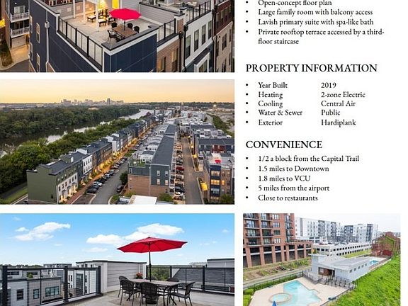 Pristine & freshly painted, exuding modern sophistication. The heart of the home includes the open concept living & dining, accented with Luxury vinyl plank flooring, a gourmet kitchen with white custom cabinets, sleek quartz countertops & stainless appliances. Primary bath offers two separate vanities (nice amenity). Please note: This home has Smart light switches and thermostat and is pre-wired for CAT6 internet. Rocketts Landing is Richmond's only urban Riverfront community. Imagine living in this desirable community which has direct access to the scenic Capital Trail (which runs from Richmond to Williamsburg) and Rockett’s Landing Marina, where adventure and tranquility intertwine. Conveniently located literally minutes to downtown and VCU. Only 10 minutes to Richmond International Airport. Rocketts also offers resort-style amenities: 2 sparkling pools & picnic area by the James River, dog park, and state-of-the-art gym. Experience the best of Richmond’s Riverfront Living in Rocketts Landing.