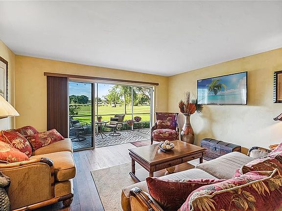 Breathtaking sunsets and panoramic golf course views highlight ground floor vista from the spacious lanai in this renovated two-bedroom, two-bath residence.