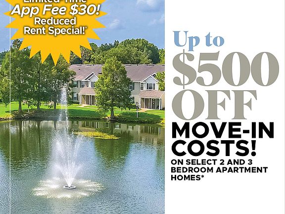 - Special offer! Up to $500 OFF Move-In Costs on Select 2 and 3 Bedroom Apartment Homes* Plus, Limited Time Reduced App Fee of only $30! *Must move in by 10/17/25. Restrictions apply, contact leasing office for details.