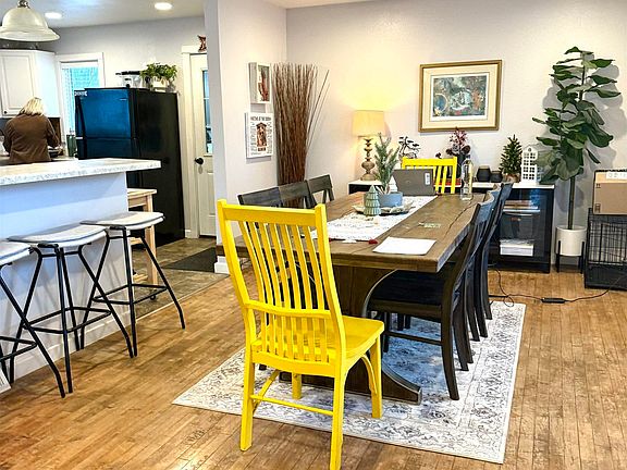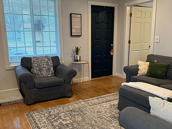 3 bed 2 bath Craftsman-style home with a first-floor bedroom and bathroom, a laundry room, and an attached garage. Renovated throughout with hardwood floors, cozy living room, and large kitchen.