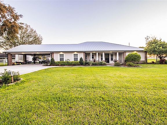 Prepare yourself to be amazed with this custom built, 3 bedroom, 3 bathroom, 2 half bath, masterpiece on a .86 lot. The location is minutes from the interstate with easy access to Orlando, Tampa, the Lakeland/ Winter Haven area, and a stones throw from the Van Fleet Trail. The original owner is a forth generation builder & mastermind of the construction, upgrading and upkeep of this immaculate estate home. The fully fenced yard and superb curb appeal greets you at first glance. The large parking pad with a 4-car carport and detached 2 car garage can accommodate several vehicles, boats, trailers, etc.. As you approach the ranch style and welcoming front porch with swing you will immediately notice the newly installed metal roof. Entering the home, you are welcomed in with an open floor plan overlooking the spacious living room with white oak flooring, crown molding, gas burning fireplace, and energy efficient pocket sliders leading to the incredible screened-in lanai. The kitchen is a chefs delight; granite countertops, white oak wood flooring, custom soft close white oak cabinets & drawers, upgraded barn sink, cook top with 6 hard piped vent, double convection ovens, and vinyl bottomed cabinets & drawers. The dining room provides ample space for your large dining table & gatherings. The master suite is jaw dropping; features include engineered bamboo wood floors, tray ceiling, energy efficient doors leading to the lanai, electric fireplace for heat & ambiance, and 2 enormous sperate walk-in closets w/ custom sliding barn doors. The master bath will add to your eye gazing experience, with marble dual vanity, clawfoot soaking tub, European style glass entry to the large shower stall w/ 3 unit diverted shower system, and storage. The additional 2 bedrooms are situated based on a split bedroom plan. One bedroom with a dedicated full bathroom, and additional recently updated hall bathroom. If you are looking for a top shelf media/ bonus room there is a 23x20 bonus room (pool table & TV included) which provides a half bath, custom bar with granite counters, custom cabinets w/ bar stools included, sink, refrigerator, Bose surround sound system, recessed ceiling and tile flooring. The screened in lanai is perfect for entertaining; with custom built swing, pavered deck, 4 fans, outdoor gas grill w/ vent, sink, storage, and tranquility. The detached 2 car garage is currently used for storage and a workshop. There is ample storage space with a half bath, full 2 car garage door & bay door in the rear. The owners have installed a solar system that is attached to the home on above the carport and detached garage; transferable cost of $175 per month. With the energy efficient standards of this home, the maximum electric bill is $50 total. Other features of the home include 2 zoned HVAC (the large 5-ton unit newly installed), water filtration system, energy efficient windows throughout the home with storm impact rated windows in the master bedroom, 7 zoned irrigation with drainage system, seamless rain gutters, 2 tankless water heaters, firepit w/ concrete slab, and much more. This home was built like a castle with solid steel beams in the foam insulated walls, solid construction inside and out, added insulation is attic, and fully treated for termites/ pests on a quarterly basis. The home is also pool ready if a newer owner desires this with room and no obstacles in the way. This home is an absolute must see for the owner that desires perfection.