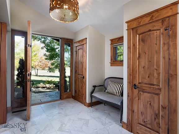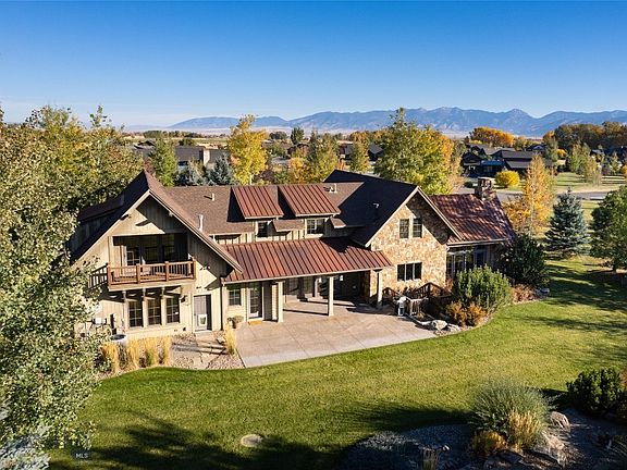 Realize your Montana dream with this incredible 1.24 acre estate in the quiet Spanish Meadows neighborhood of Bozeman. The spectacular home embodies the spirit of the rocky mountains with timber beam work, rock fireplace, solid hickory flooring and thoughtfully balanced with a refined elegance perfected by Abby Hetherington Interiors. Ample spaces include an airy great room with mountain views framed by floor to ceiling windows, a stunning formal dining area, and lovely main level master suite. The upper level features 3 bedrooms/office, and an inviting family/game room with custom wet bar and balcony over looking the Spanish Peaks. The huge partially finished basement allows for expansion of your vision, and includes a cinderblock fortified vault for valuables. The remarkable landscaping features perennial gardens, fire pit area, custom designed waterfall, and mature trees for privacy. Ideally located in Monforton district minutes from BZN airport, downtown Bozeman, and Big Sky.