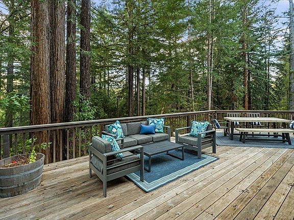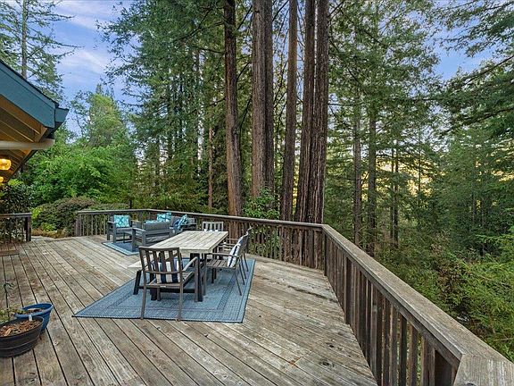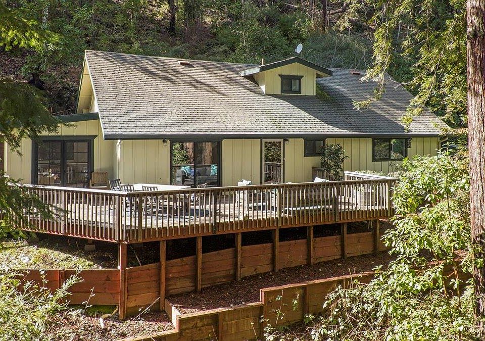 Quietly nestled amongst mature redwoods and madrones, up a private drive less than a mile from the Brookdale Lodge and 1/4 mile off Highway 9 sits 200 Prospect Ave., a 4BR/2.5BA retreat with a 200+ sqft. redwood deck, a detached 2-car garage with a Tesla EV Charger, fire retardant siding, a new metal water tank and piping, a new networked whole-home generator with automatic transfer switch, upgraded drainage, and more. Walk into a spacious living room that faces the redwood deck and majestic redwood trees. The spacious dining room/sunroom is splashed with natural light and opens to the kitchen and breakfast nook, complete with a professional grade Wolf range, ample storage and counter space, and a built-in wine rack. Two bedrooms are on the main floor including the primary suite, and the powder room and laundry room make single level living an easy option. Upstairs are two additional bedrooms that share a bathroom, along with a rear deck and awesome hidden attic nooks that provide tremendous storage, perfect hide-and-seek hideouts, or room for a cozy workshop or music studio. Almost three acres of beautiful forest and a turnkey home, this is mountain living at its finest, and less than a mile to downtown Boulder Creek!