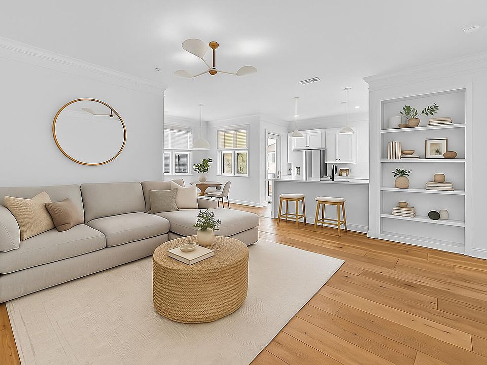 Wrapped porchCozy middle-floor corner unitModern lighting selectionsBuilt-in shelvingStainless steel appliancesFountain-filled parksCozy breakfast area