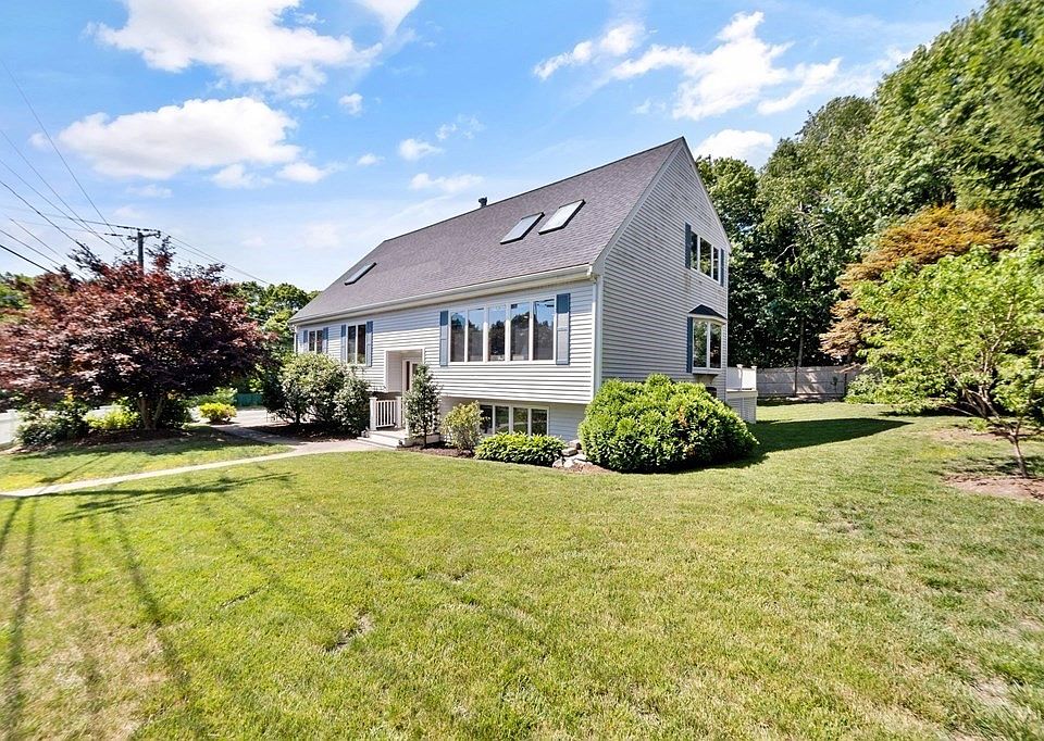 BUYERS GOT COLD FEET! Fully renovated Milton single family located in desirable western suburbs, easy access to I93, close to the commuter rail, Tucker Elementary/Milton Academy, MS & HS, Blue Hills, easy commute to Boston! The tri-level Cape style home has an open layout, unbelievable natural sunlight, soaring high ceilings w/ charming exposed wood beams, beautiful living and dining area that leads to the wonderful deck and good size backyard, modern kitchen w/ granite countertops/gas cooking/stainless steel appliances. There are 3 good size bedrooms and a full bath on the first floor, second floor has another living area and a large primary bedroom and gorgeous bathroom (tub and shower)! Lower level is a finished basement with a full bath/laundry room and access to the 2 car garage. Renovations in last 6 years - Owner owned Solar (generates free electricity AND $250/month) Roof; New Central AC; New Boiler; New Indirect water tank; Brazilian Ipe hardwood deck.