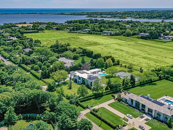 An elevated luxury lifestyle awaits in Water Mill South. Beyond spectacular, the brand-new 2.4-acre estate provides 18,901+/- sq. ft. on 3 levels with 10 bedrooms, 13 full and 2 half baths, a third-floor rooftop deck, plus a sunny pool, pool house, and tennis. This generational estate boasts premium materials and construction with hurricane-grade masonry and steel shell. This appreciating street is minutes to world-famous ocean beaches and adjacent to an expansive agricultural reserve. Interiors beam with natural light and wide open views of the sprawling, resort-like grounds. Past the grand entry foyer, open-concept living flows throughout the first floor's great room, encompassing a living room with a fireplace, a gorgeous eat-in kitchen alongside a separate chef's kitchen, and a chic glass wine display. A morning room is off one side of the kitchen and a dining room is off the chef's kitchen. An office is also on this side of the floor, along with a mudroom and a 3-car garage. In addition, the first floor hosts a VIP suite with a walk-in closet and luxe bath, and a junior primary suite, along with a powder room, coat closet, and elevator serving all levels. Each level is accessed by an elevator. Upstairs, the oversized rooftop deck captures beautiful views over Mecox Bay. The ultimate in luxury, a spacious primary suite upstairs features a private terrace, wet bar, plus a bathroom and walk-in closets. Six additional en-suite bedrooms, two with private balconies, are also on this level, along with a laundry room on each level. Below, the lower level is ready for year-round luxury with a full movie theater with stadium seating, a game room, golf simulator, a large gym with a full bath and a living room with a refreshment area. Adding appeal, the whole home has a backup generator and solar energy panels. Outdoors, enjoy the 18'x50' pool and spa, plus a clay court tennis court and several access points to Mecox Bay from Rose Hill Road. Located minutes from ocean beaches and Bridgehampton's horse and wine country.