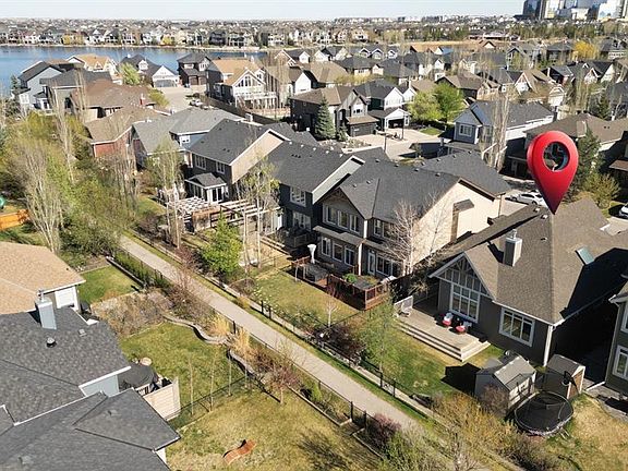 Welcome to this Albi-built, custom-crafted bungalow in the heart of one of Calgary’s most desirable lake communities. Just nine homes from the shared dock, this residence offers a perfect blend of luxury, comfort, and rare lake access. From the moment you arrive, the curb appeal makes a statement—stained solid wood garage doors, full-height brick columns, and pristine landscaping set the tone for what’s inside. Step into a warm foyer that opens to a bright, open-concept layout featuring soaring 10-foot ceilings, transom windows, and rich hardwood floors throughout the main level. The gourmet kitchen is designed to impress, with ceiling-height cabinetry, granite countertops, a central island with spice cabinets at both ends, built-in wall oven and microwave with warming drawer, and a walk-through pantry for everyday convenience. The adjacent living room offers a cozy gas fireplace framed with custom millwork and expansive windows that fill the home with natural light while showcasing views of the backyard. A formal dining room provides an elegant space for entertaining, while the built-in home office is both stylish and functional. The spacious primary suite is a true retreat, complete with a spa-inspired ensuite featuring heated tile floors, a jetted tub, walk-in shower, dual vanities, and skylight. The walk-in closet even has its own window for natural light. The fully finished basement expands your living space with 9-foot ceilings, a large recreation room, two additional bedrooms, office space, and a full bathroom—ideal for family or guests. Outdoors, your sunny backyard oasis awaits with a spacious deck overlooking the greenbelt and walking path. Whether hosting or relaxing, it’s the perfect extension of your living space. And with the lake just steps away, every day feels like a vacation. Additional highlights include central air conditioning, toe-kick vacuums in the kitchen and ensuite, oversized windows, and the welcoming sense of community this neighbourhood is known for. This isn’t just a home it’s a lifestyle.