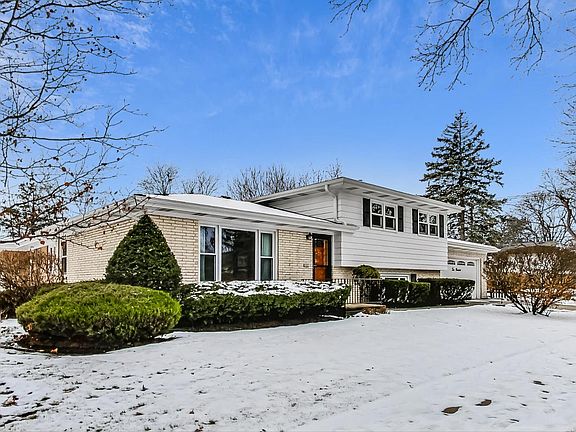 Home's front door and garage face Evergreen Ave. Spacious 3-bedroom, 2-bathroom split-level home with a 2-car garage offering additional storage and space. The remodeled eat-in kitchen features Corian countertops, stainless steel appliances, and a pantry cabinet with pull-out drawers for added convenience. Both bathrooms have been updated, and hardwood floors are found in the foyer, kitchen, and upstairs bedrooms/hallway. Newer mechanicals provide peace of mind. The large yard offers plenty of outdoor space, and the patio is perfect for entertaining. Enjoy cozy evenings in the lower-level family room with a gas fireplace. Conveniently located near parks and everything downtown Mount Prospect has to offer-restaurants, shops, library, Metra train station, and more. Award-winning District 57 and Prospect High School. Don't miss this opportunity!