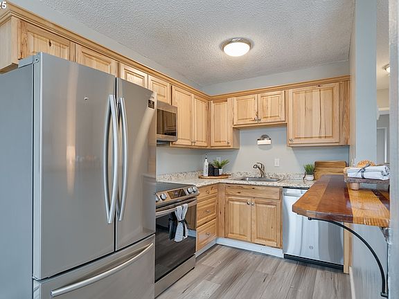 Don’t miss this exceptional opportunity to own a cute, stylish one-bedroom top-floor condo below last year’s price in a fast-growing area — perfect for savvy buyers! Enjoy sweeping views of Gresham Butte, modern updates, and a managed community with a variety of notable amenities, including rentable guest houses, affordable garages, secure RV/boat parking, an indoor pool (currently closed for the season), rec room tours by request, gym, sauna, clubhouse, and tennis court. The kitchen features stainless steel appliances, sleek cabinetry, and luxury vinyl flooring that flows into the living area, while the spacious bedroom offers a large double closet and plenty of storage. Parking is plentiful and flexible; the seller states the assigned spot was deeded at the time of purchase, though buyers should verify and conduct due diligence. The community is safe, with regular security patrols offering peace of mind without intrusive management. Pets are welcome (2 per unit, no weight or breed restrictions), and rentals are allowed (no restrictions - currently 10–15%). Other units are available for sale, giving buyers the chance to create a close-knit or extended-family setup. While full-size laundry isn’t permitted, a portable washer and dryer may be a solution. Feel free to ask me how these work, and have your agent share the washer and dryer guidelines. The community laundromat is conveniently located just one breezeway over, and the garbage area is just around the corner on the other side. This condo delivers comfort, convenience, and lifestyle — all without the responsibilities of traditional homeownership.
