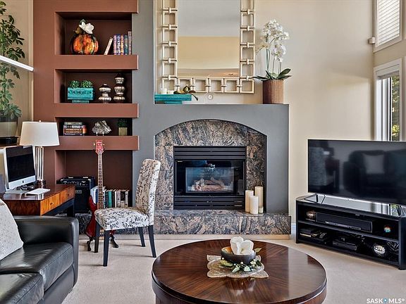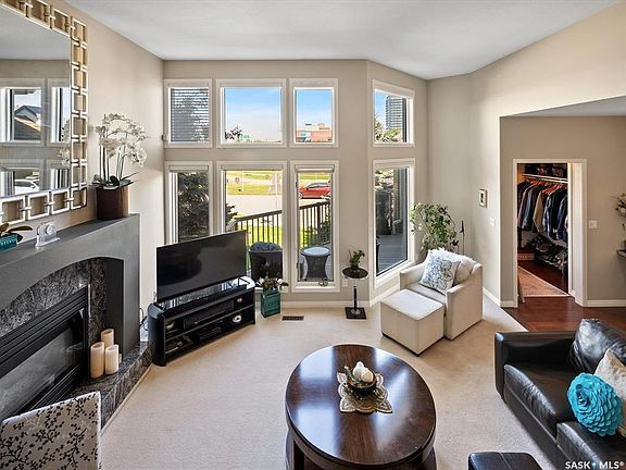 SASK CRESCENT EAST - what an impressive address - overlooks the South Saskatchewan River. This executive townhouse is professionally finished and exudes luxury on all 4 levels. Entering from the covered entry you will be welcomed by a spacious foyer. The formal living room features a gas fireplace, recessed shelving and huge ceiling-to-floor windows which let in tons of natural light. The dining area provides a spectacular view of Saskatoon skyline. Garden door to the west-facing deck. The kitchen has ample cabinets, 5 stainless steel appliances that include a Fisher&Paykel double drawer dishwasher. There is a built-in china cabinet for crystal and a lower-level wine rack. Convenient pantry. The primary bedroom has a walk-in closet, ceiling fan and a 5 piece en-suite with heated floor. The top floor houses a large family room with vaulted cathedral ceiling, exceptionally bright. 4th level has a 2nd family room, guest bedroom and 4 piece bathroom. Large windows make this an inviting area. The 3rd level laundry room has built-in cabinets, LG ThinQ washer, TruSteam dryer, storage closet, utility room, mirrored-door closet and provides direct access to the attached 2 car garage with in-floor heating. This home has engineered hardwood flooring in the foyer, kitchen, dining area and primary bedroom. The 3rd and 4th levels have in-floor heat. Central air, central vac with power head, granite counter tops in the kitchen and in all 3 bathrooms, Hunter Douglas window treatments, keyless entry, reverse osmosis system, underground sprinklers, natural gas barbeque hookup and composite decking, 4 flat-screened attached TVs. Pet-friendly. For an active lifestyle, this home is situated across from Rotary Park, close to trails and within easy walking distance of downtown. This prime unit, with exposure to the west, provides that much sought-after natural light, a second west-facing deck and room for two vehicles on the driveway.