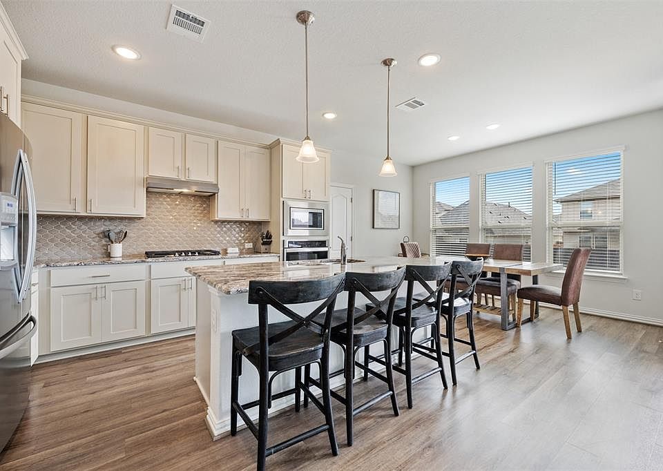 Welcome Home! UPGRADED and Move-In Ready! This stunning 2-story home sits proudly on a spacious corner lot, just a short walk from Larkspur Elementary. Designed with both comfort and style in mind, it offers an open floor plan filled with natural light and thoughtful UPGRADED features throughout. The inviting family room boasts soaring ceilings and a cozy gas fireplace, creating the perfect spot to gather. The chef’s kitchen is open to the living area and features shaker-style cabinetry with modern hardware, a gorgeous tile backsplash, granite counters, built-in stainless steel appliances, and a breakfast bar. Refrigerator, washer, and dryer all convey, making this home truly move-in ready. A pocket office just off the kitchen provides a convenient workspace or study nook. The primary suite is located on the main floor and feels like a retreat, complete with a spa-inspired bathroom featuring dual granite vanities, a soaking garden tub, a spacious shower with bench seating, and a walk-in closet. A secondary bedroom and full bath on the main level make hosting guests effortless. Upstairs, enjoy a bright and airy game room along with two additional bedrooms that share a full bath with dual sinks. In total, the home offers 4 bedrooms and 3 full baths. Step outside to the covered back patio overlooking a large, fully fenced yard with a sprinkler system—perfect for entertaining, play, or relaxation. The garage includes a 3-foot front extension, providing extra storage and parking space. Adding to the appeal, this home is within walking distance to the San Gabriel River and the highly anticipated Costco, expected to open by the end of the year. The brand-new Valor private school is also nearby, a sought-after option for many families in the area. Convenient access to Ronald Reagan Blvd and 183 places retail, dining, and shopping just minutes away. With its upgrades, location, and lifestyle conveniences, this one is a must-see!