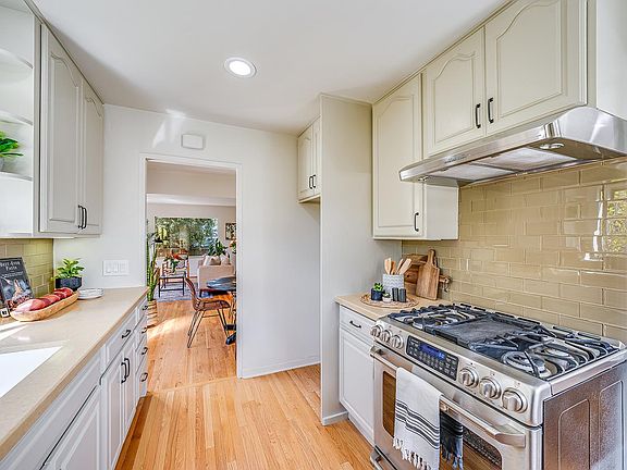 Out back, the spacious lot is fully fenced and landscaped with drought-tolerant plants and a patio. The detached garage has alley access and presents an opportunity to convert into an ADU.