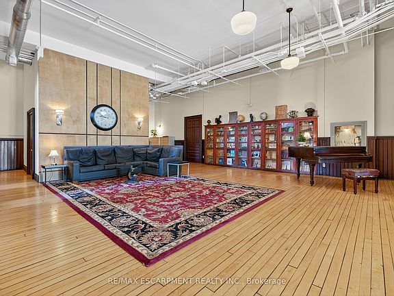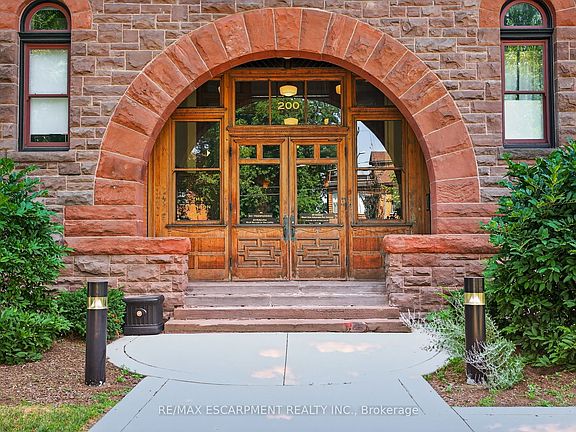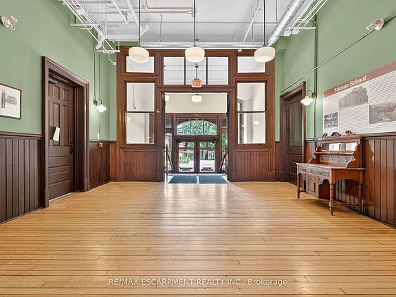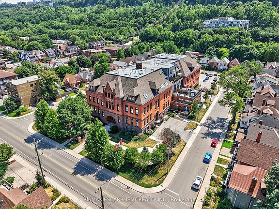 Live in the grooviest space ever! Welcome to the historical heritage Stinson school lofts. The building is centrally located, close to downtown and the escarpment, between three Hamilton Hospitals, the GO Station, plenty of transit, bike lanes, an ideal location for commuters. This bright and open two-storey loft has gorgeous hardwood floors, exposed brick walls and beamed ceilings. The open concept main floor seamlessly connects the kitchen, dining, and living areas, with a vaulted ceiling that makes this huge space seem even bigger somehow, with stunning views through the skylight windows. This kitchen has a rustic charm and modern luxury, with a granite and quartz island complete with an integrated outlet for electronics. The exposed wooden beams and brick backsplash gives an old-world feel, while the updated appliances make the space contemporary. The main level has a floor laundry room and two-piece powder room as well. Upstairs, the primary suite has a massive window with escarpment views. There is a full ensuite bathroom and a huge walk-in closet as well. The second bedroom features more exposed brick and a large, screened skylight that can be opened. The second bedroom is large and can be used is a variety of ways. Welcome home! RSA.