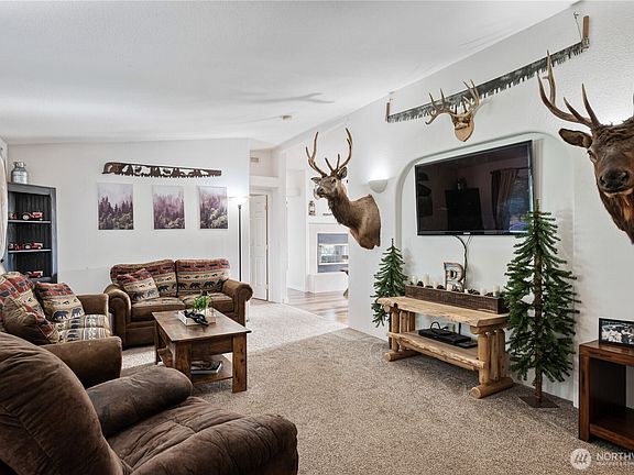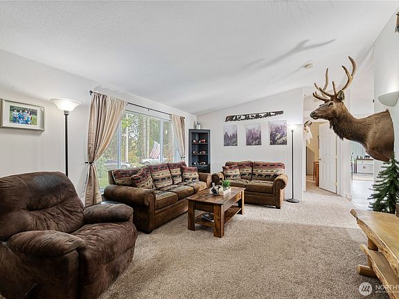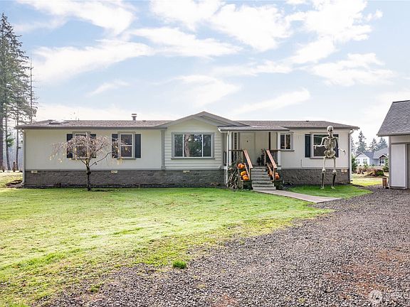 Beautifully updated home on 3.34 level acres in a dream location. Meticulously kept "2004" manufactured home boasting 1,876 SF, 3 bdrm, 2 full bthrms, cozy living rm w/vaulted ceiling, kitchen w/oak cabinetry-center island-tile countertops-pantry, dining rm w/door to large covered deck & double sided FP shared with light & bright family rm w/LVP flooring, primary bdrm w/ensuite-soaking tub-separate shower-walk-in closet, laundry rm w/deep sink, spacious office, Trane heat pump, vinyl windows, newer roof on home-shop-strge shed. The grounds offer an 1,140 SF 3 bay shop/garage w/loft, raised garden beds, greenhouse, 3 car carport, wood shed, chicken coops, 5 fruit trees, Blueberry & Raspberry Patch & nature trails through majestic fir trees.