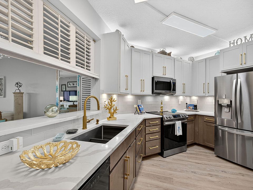 Step into coastal chic perfection--this immaculate residence has been fully remodeled with timeless style and modern touches throughout. The modern design kitchen is a true showpiece, featuring all-new custom cabinetry with brass accents, gleaming quartz countertops, and a designer glass backsplash. Luxurious bathrooms showcase custom vanities, while the spa-like primary bath invites relaxation with a marble-detailed jacuzzi tub & a spacious walk-in closet. Every detail has been thoughtfully curated, from custom light fixtures in every room to waterproof laminate flooring paired with elegant travertine in the entry and guest bath. Walls of windows frame breathtaking lagoon and pool views--wake up to serene sunrises and unwind with vibrant, colorful skies at night. Set within a tropical, gated community, resort-style amenities including two sparkling pools with hot tubs, a fitness center, BBQ area, dog park, and more. Ideally located just minutes to pristine beaches, world-class dining, boutique shopping, boating, and golf.