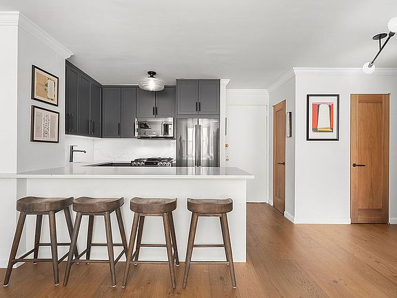 With extraordinary attention to all details, this custom crafted, triple mint and sun filled home with open city views (w/angled view to midtown) resides in The Gloucester, a full service luxury cooperative located in the heart of the Upper West Side. Features of this beautiful home include a large living room offering an oversized picture window, motorized UV protective shade, thru-wall AC, and a fully renovated large open kitchen with stainless steel Samsung appliances, Caesarstone countertops and backsplash w/countertop seating, & Kitchen Craft cabinetry with custom black steel hardware. This home also offers a large primary bedroom complete with built-in bedside lighting, a double sized custom fitted closet, a motorized black out shade, a picture window and thru-wall AC, and a fully renovated hall bathroom w/soaking tub, floor-to-ceiling white subway tiling, Toto & Kohler chrome fixtures, & a custom walnut and marble vanity. Gorgeous Hudson Company 8” wide knotted oak flooring throughout, solid walnut frameless doors, crown molding, large custom closets, custom Buster and Punch hardware, and custom lighting & window treatments completes this mint and move-in-ready home. BLD: 24 HRDM, resident superintendent, porter, attended garage, renovated lobby, hallways and elevators, central laundry room, planted and lit roof deck with Hudson River and wide open city views, pets and pied-a-terre welcome! Best WS location, near Central and Riverside Parks, multiple grocery options (Citarella/Fairway/Zabars/Trader Joe/Whole Foods/Columbus Ave Greenmarket),cultural offerings (Museum of Natural History, Children's Museum, JCC, Hayden Planetarium), numerous restaurants, adjacent Citi bikes, subway (#1,2,3,C) and bus transportation!