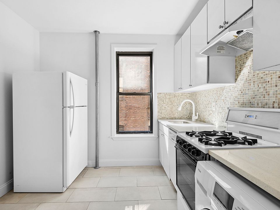 Windows in every roomSundrenched apartmentLaundry unitNewly remodeled kitchenWhite tile backsplashWhite cabinetryPrewar building