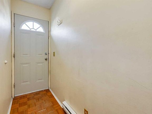 Spacious foyerClassic white appliancesTimeless travertine tile backsplashDurable butcher block countertopsUpdated white cabinetryPrivate balconyCombined laundry room